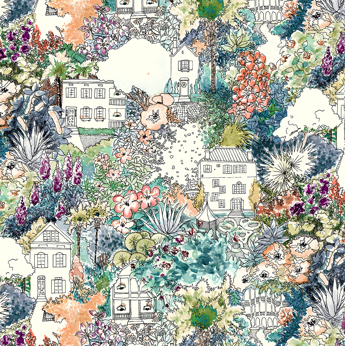 A collection of print designs inspired by John's Island, South Carolina. Natural elements and textures create a tranquil, tropical ambiance.